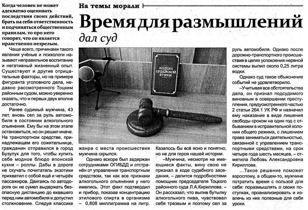 В Тоцкой общественно-политической газете "Авангард" № 9 опубликовано интервью помощника председателя суда Кирилловой Л.А. "Время для размышлений дал суд"
