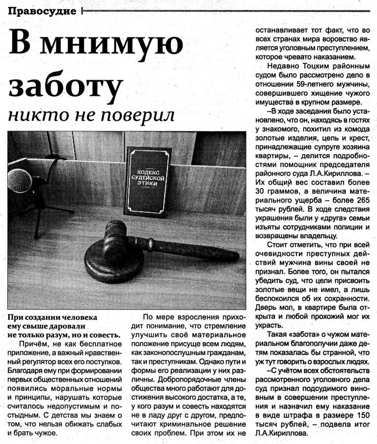 В Тоцкой общественно-политической газете "Авангард" № 10 опубликовано интервью помощника председателя суда Кирилловой Л.А. "В мнимую заботу никто не поверил"