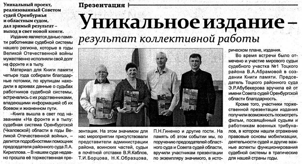 В Тоцкой общественно-политической газете "Авангард" № 11 опубликовано интервью помощника председателя суда Кирилловой Л.А. "Уникальное издание - результат коллективной работы"