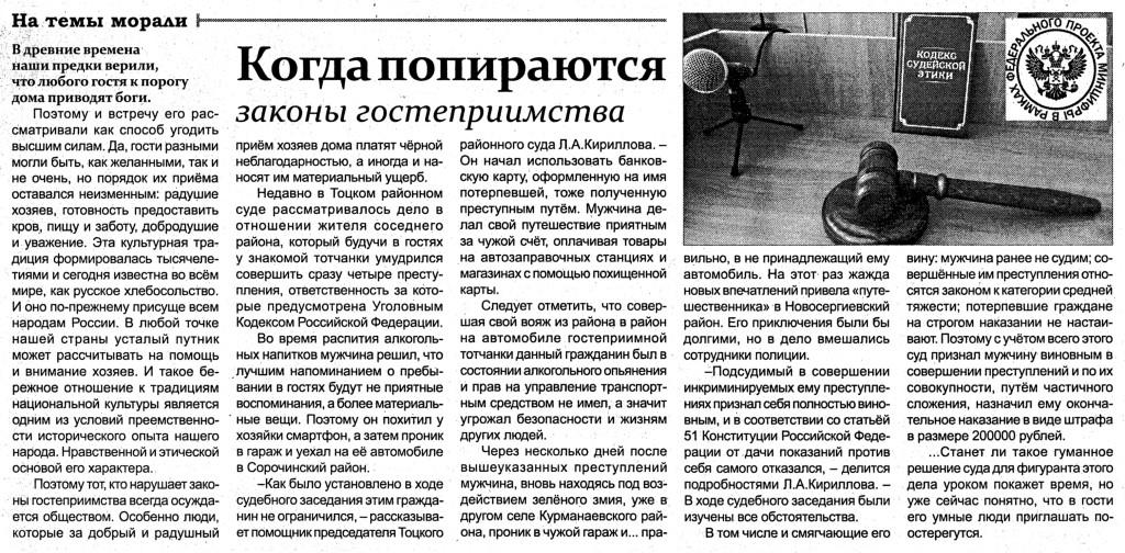 В Тоцкой общественно-политической газете "Авангард" № 11 опубликовано интервью помощника председателя суда Кирилловой Л.А. "Когда попираются законы гостеприимства"