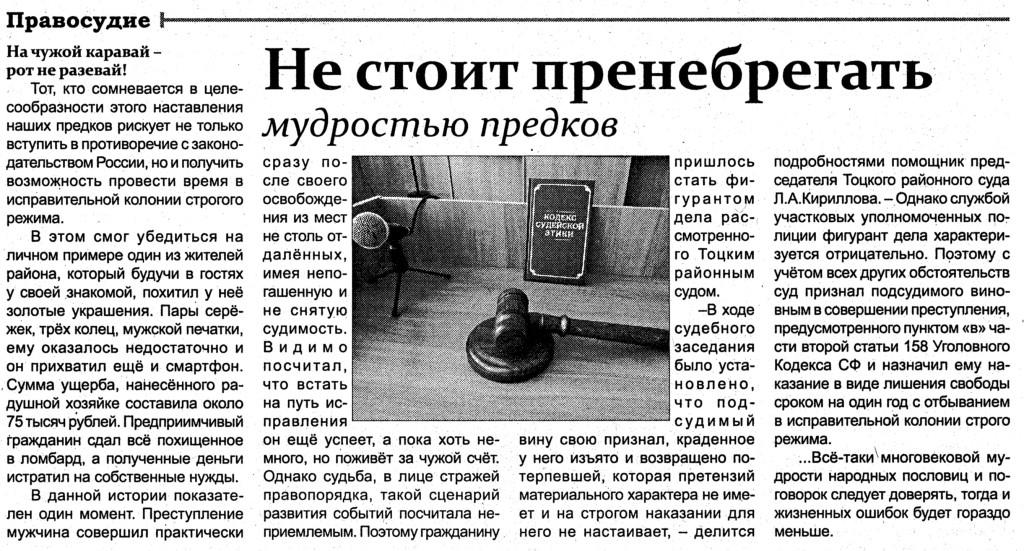 В Тоцкой общественно-политической газете "Авангард" № 12 опубликовано интервью помощника председателя суда Кирилловой Л.А. "Не стоит пренебрегать мудростью предков"