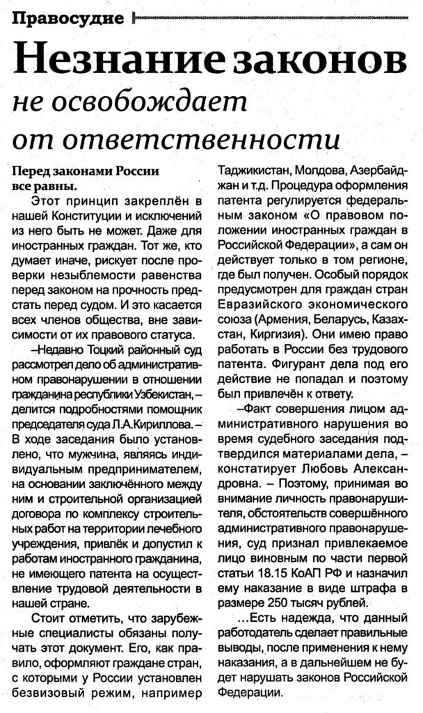 В Тоцкой общественно-политической газете "Авангард" № 14 опубликовано интервью помощника председателя суда Кирилловой Л.А. "Незнание законов не освобождает от ответственности"