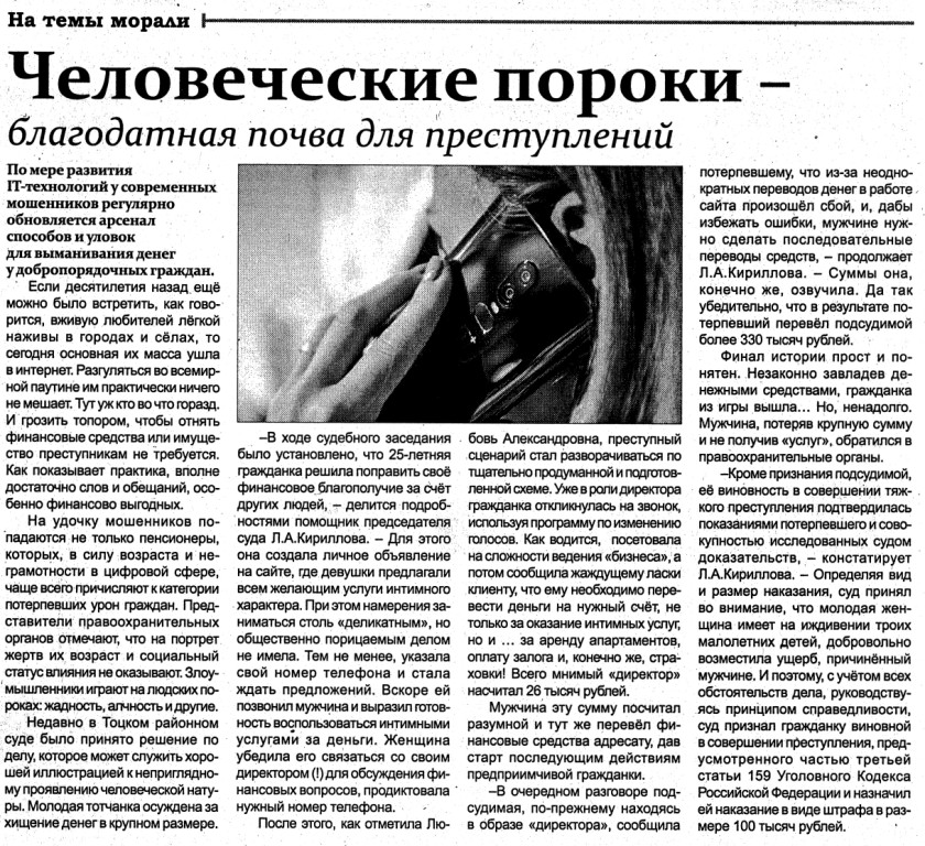В Тоцкой общественно-политической газете "Авангард" № 15 от 19.04.2025 г. опубликовано интервью помощника председателя суда Кирилловой Л.А. "Человеческие пороки - благодатная почва для преступлений"