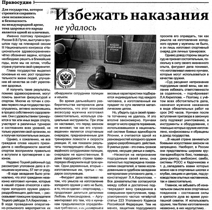 В Тоцкой общественно-политической газете "Авангард" № 29 опубликовано интервью помощника председателя суда Кирилловой Л.А. "Избежать наказания не удалось"